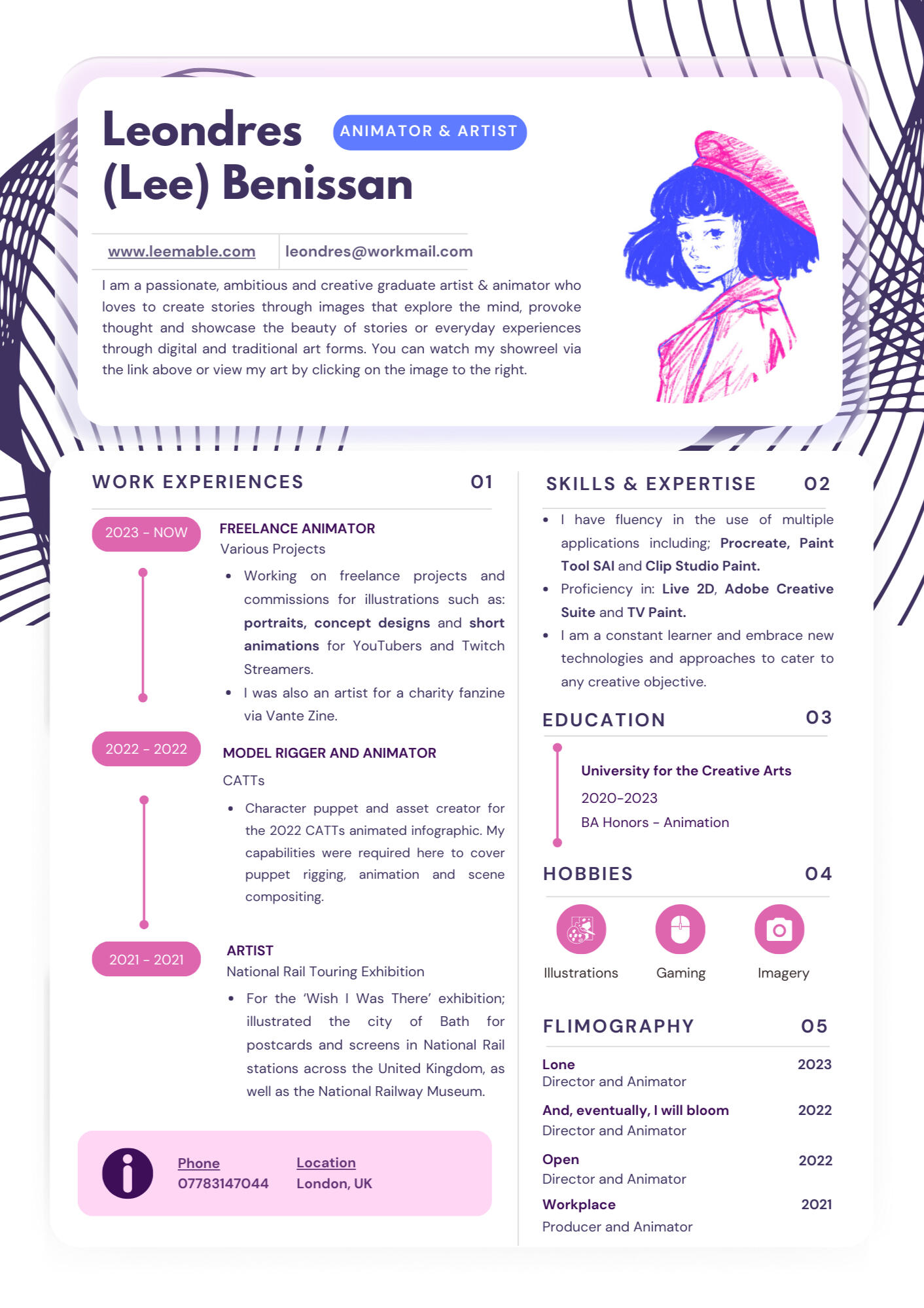 Leondres (Lee) Mable Benissan is an animator and artist, graduated from the University for the Creative Arts. With a passion for storytelling, her films are primarily experimental, focusing on elements such as mental health and identity. Her art ranges between digital creations and traditional creations with her favourite focus being the face.